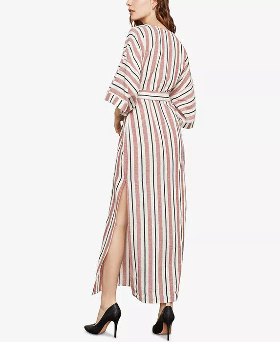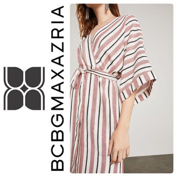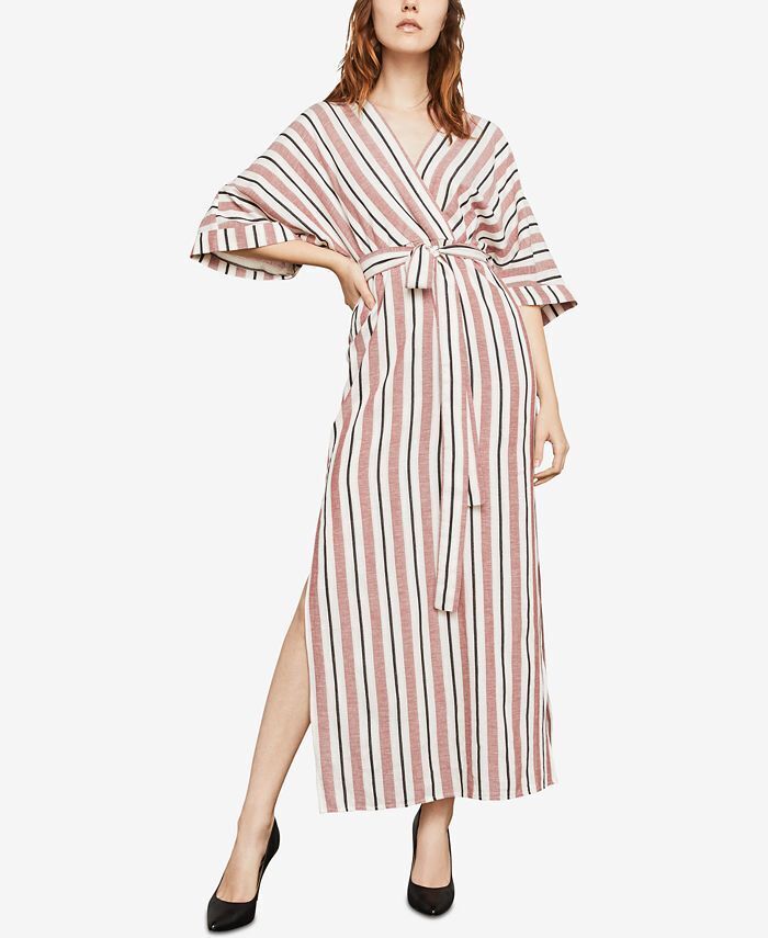 BCBGMAXAZRIA's faux-wrap maxi dress is crafted from a luxe cotton-linen blend in slimming vertical multi-stripes, and features 3/4-length sleeves and an adjustable waist-tie.