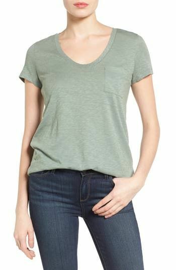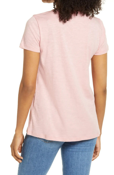 A gently rounded V-neckline, short sleeves and chest pocket style a lightweight slub-knit T-shirt that's available in a multitude of colors.