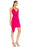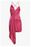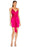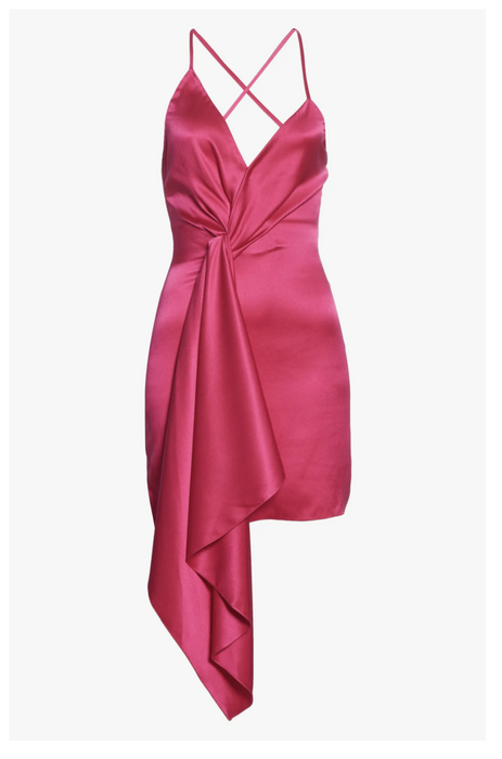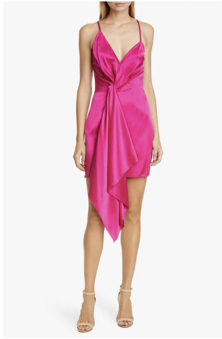 A twist gathers the asymmetrical plunging bodice and releases a sensuous drape of fabric in this vivacious minidress cut from silky satin.