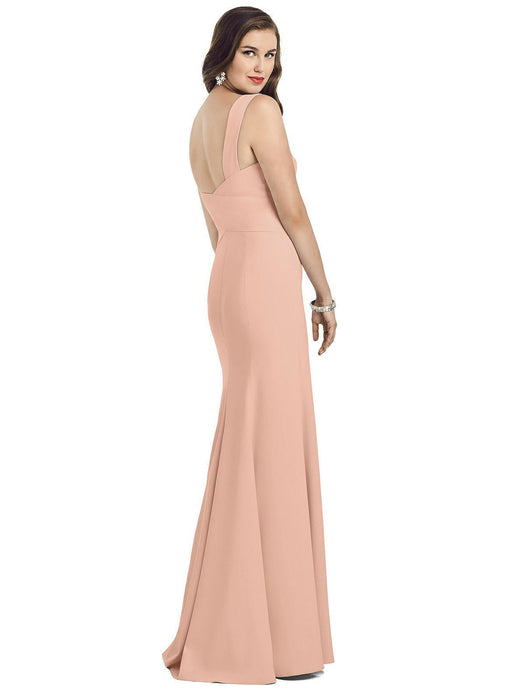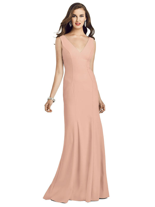 Sweeping sleeveless crepe dress makes a striking presence to any room. Classic V-neckline with wrap seamed detail along the bodice and trumpet skirt add subtle touch to a classic gown.