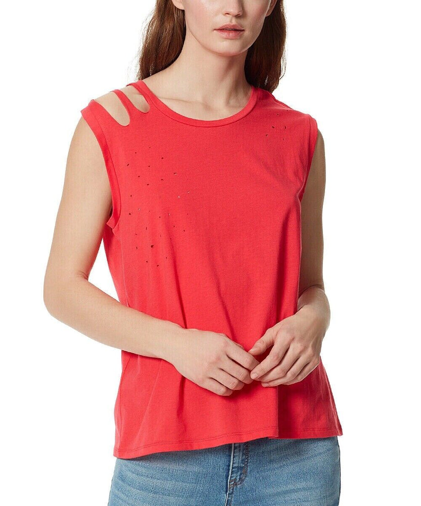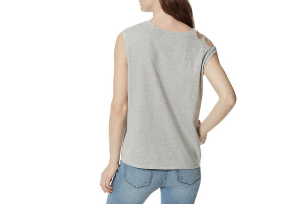 Shoulder cutouts and rhinestone embellishments add fashionably distressed style to this sleeveless t-shirt from Frayed.