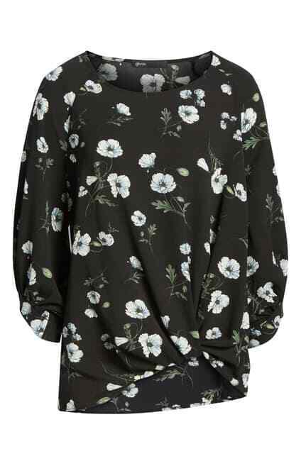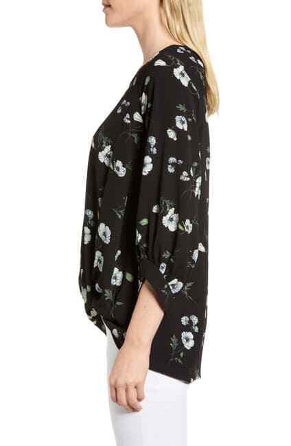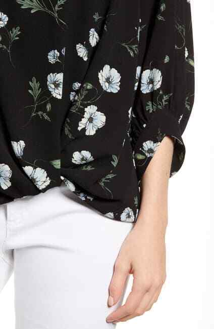 From a collaboration inspired by the everyday-easy style of popular blogger Erin Schrader, this textured crepe top features a billowed cut gathered with a twist at the hem. True to size. - Scoop neck - 3/4 sleeves - Slip on over head - Twist hem detail - Approx. 26" length