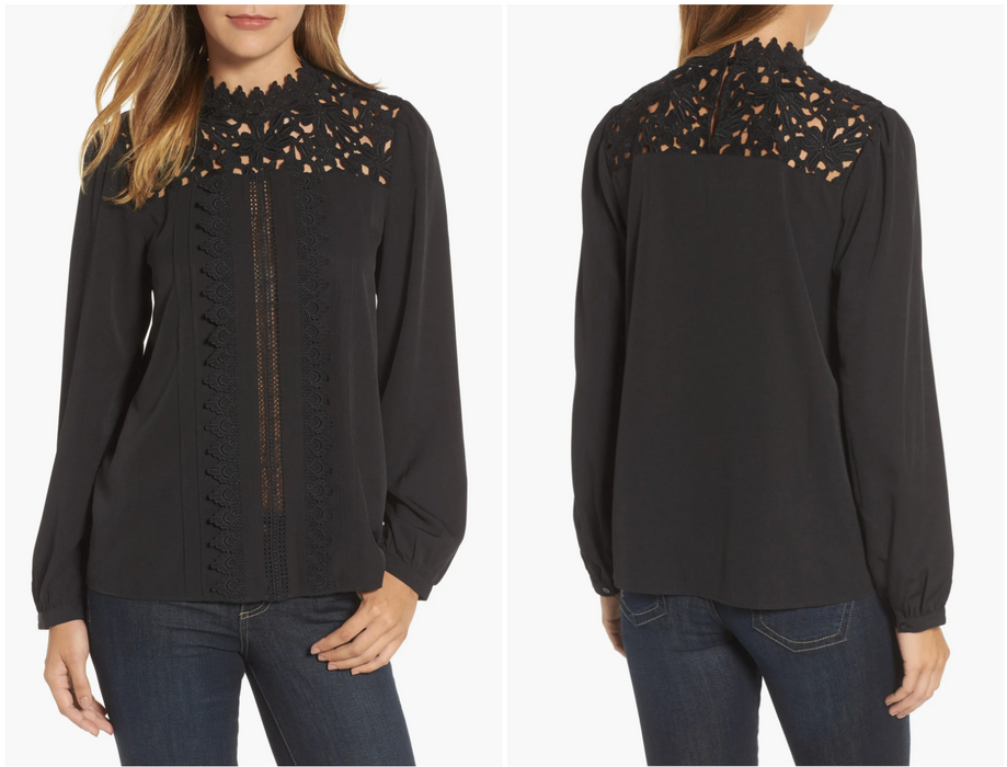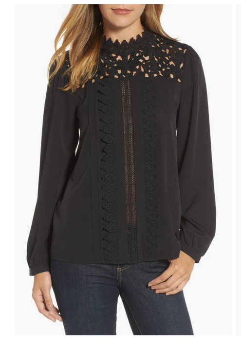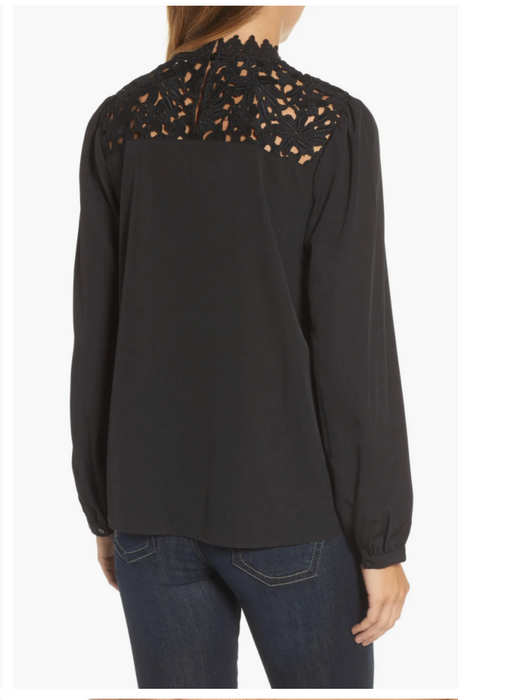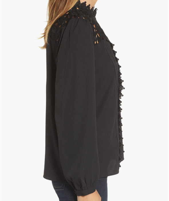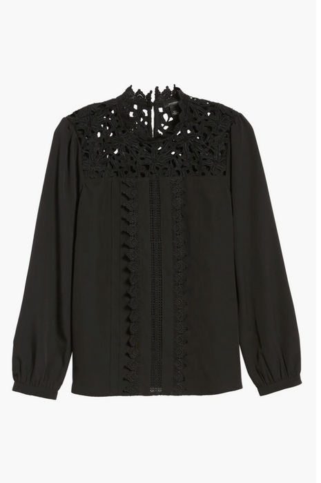 Lovely lace and elegant eyelets add irresistible feminine charm to this airy, high-neck blouse.