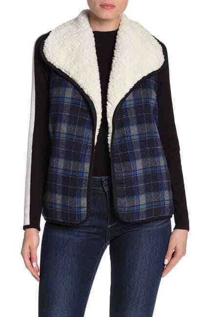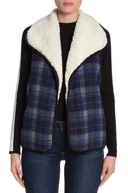 Plush, soft faux shearling offers a cozily warm look into a reversible vest with an open front. Fit: this style is one size fits most. - Spread collar - Sleeveless - Open front - Reversible - Faux shearling construction on one side - Plaid print on other - Contrast trim - Approx. 23.5" length - Imported