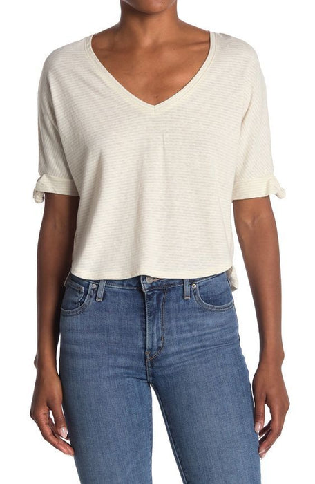 Melrose And Market Knot Sleeve Stripe Printed Cropped T-Shirt Beige Oatmeal