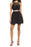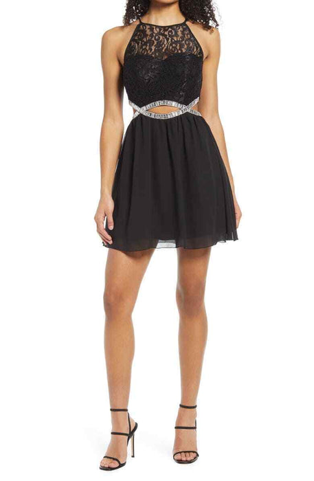 Rhinestones shine from a midriff-flashing infinity loop on this flippy party dress with a glittery lace bodice and soft chiffon skirt.