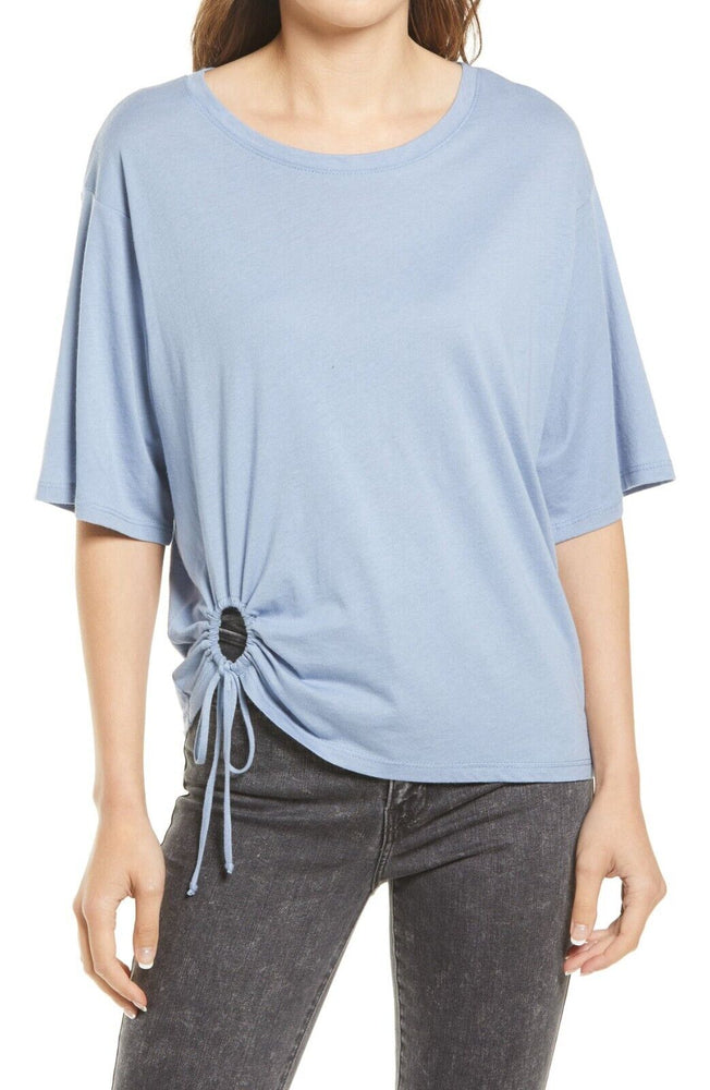 A keyhole drawstring at the hem gathers the buttery-soft jersey of this tee into soft folds that drape away from one hip. 23"length Ballet neck Elbow-length sleeves Drawstring hem 50% modal, 50% polyester Hand wash, dry flat Imported Women's Clothing