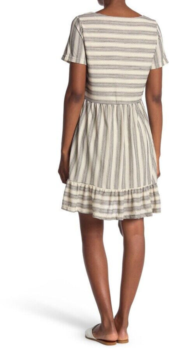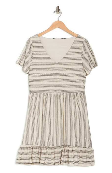 A striped V-neck dress features a cute flounced hem for effortless summer style. V-neck. Short sleeves. Slips on over head. Stitch stripes. Flounced hem. Approx. 37" length (size S). Imported 100% polyester