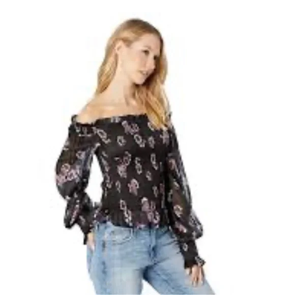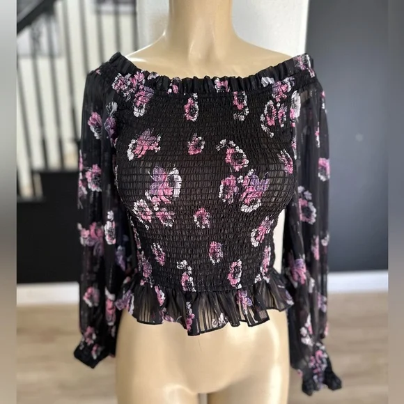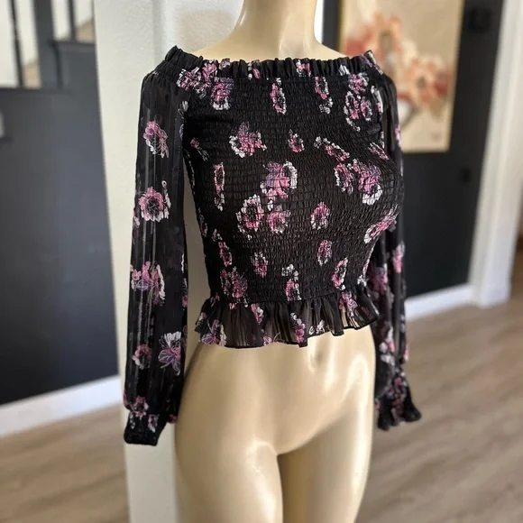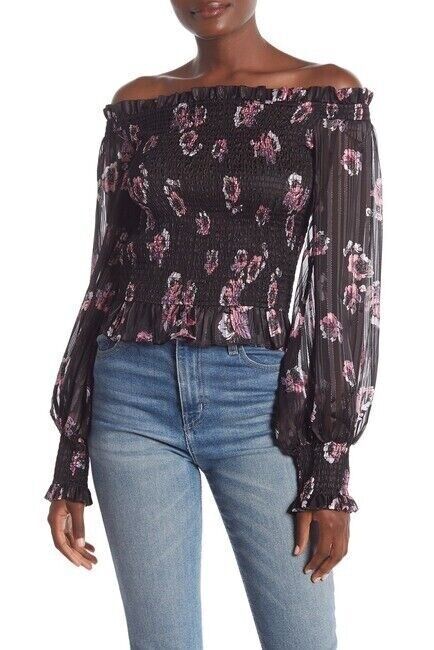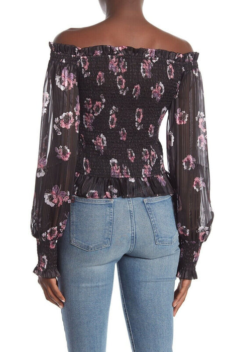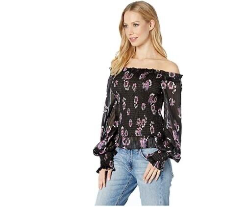This WAYF blouse is a stunning addition to your wardrobe. The off-the-shoulder neckline with ruffle accents and long balloon sleeves make it perfect for any occasion, whether you're traveling, going to a party, or just dressing up for a casual day out. The silky smooth chiffon fabric with a black and purple lurex floral pattern is both breathable and comfortable, making it suitable for all seasons. This blouse has a regular fit and is machine washable, making it easy to care for. The pullover closure and smocked design add a touch of bohemian style to the blouse. It's a must-have for any woman's collection.