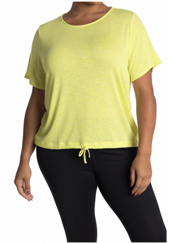 A stylish stripe T-shirt features a drawstring hem and lightweight knit construction.
